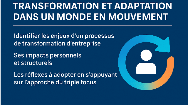 “Les mécanismes de la transformation : identifier les enjeux d’un processus de transformation d’entreprise, ses impacts personnels et structurels, les réflexes à adopter en s’appuyant sur l’approche du triple focus.”