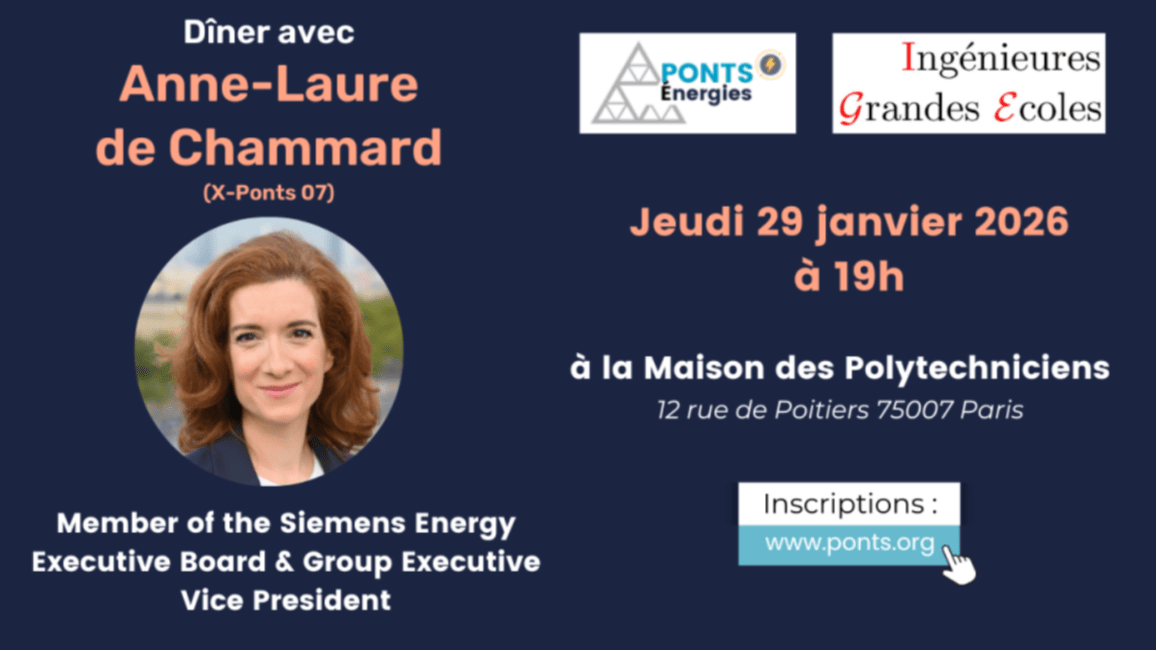 Pour des raisons d'organisation, merci de vous inscrire avant le 25 janvier 2026 au plus tard ! Lien des inscriptions : https://www.ponts.org/fr/agenda/diner-avec-anne-laure-de-chammard-member-of-the-siemens-energy-executive-board-group-executive-vice-president-5008?langue_selected=fr