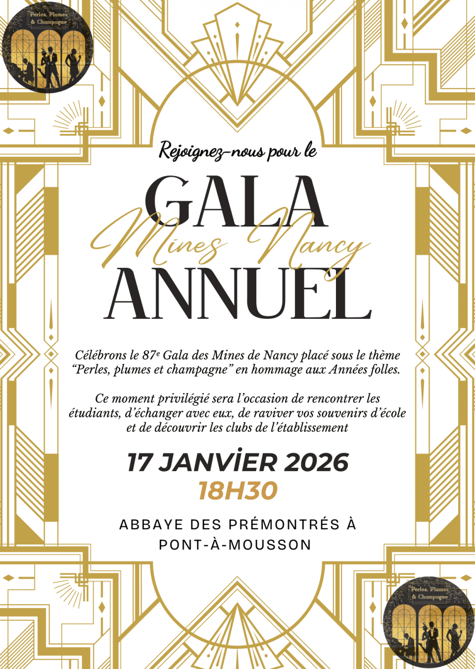 L’équipe étudiante du Gala des Mines de Nancy a le plaisir de vous inviter à la 87ᵉ édition de cet événement qui se tiendra le 17 janvier 2026 à partir de 18h30 à l’Abbaye des Prémontrés à Pont-à-Mousson.